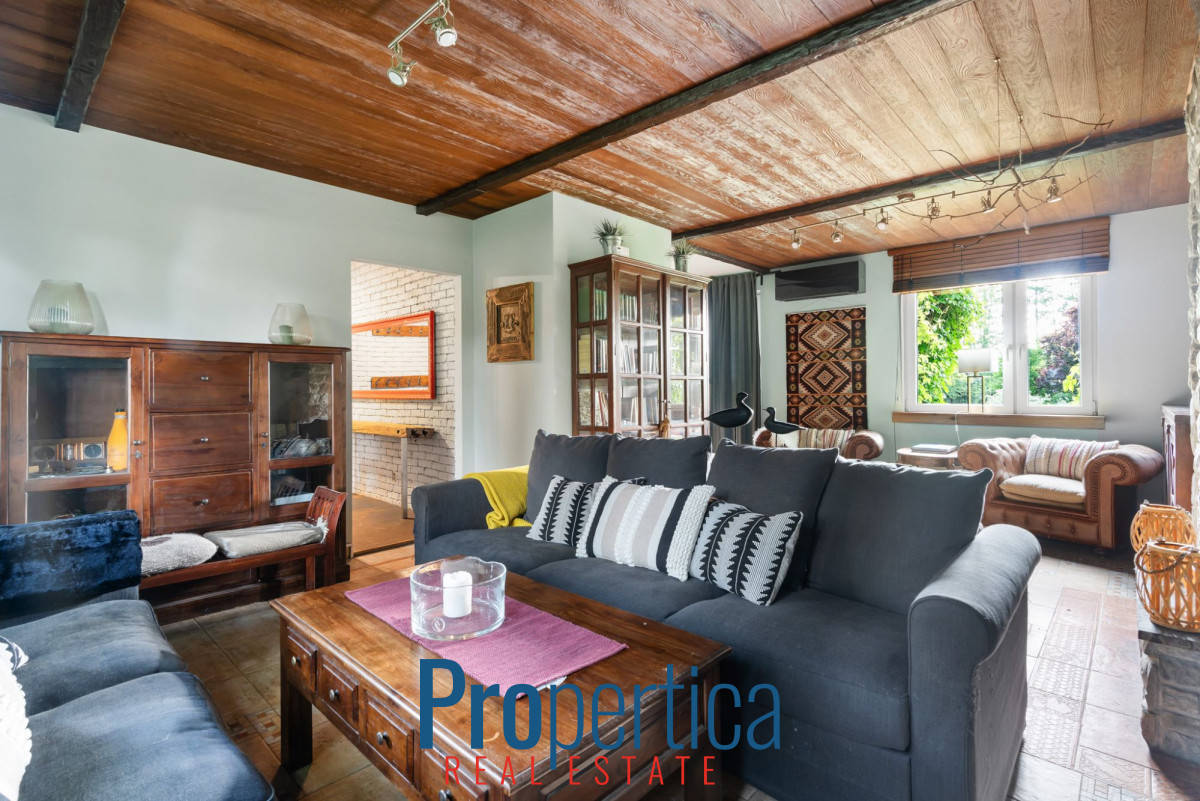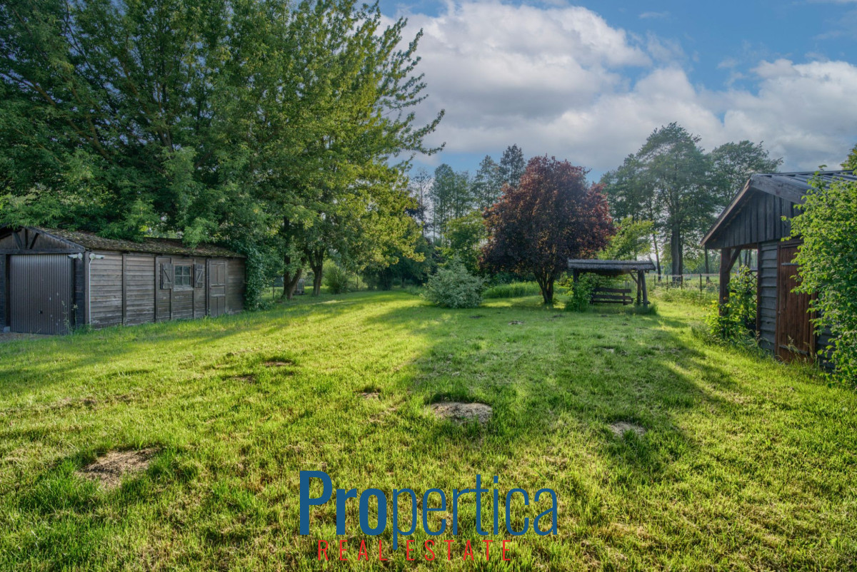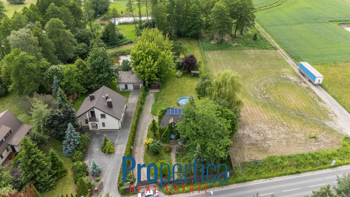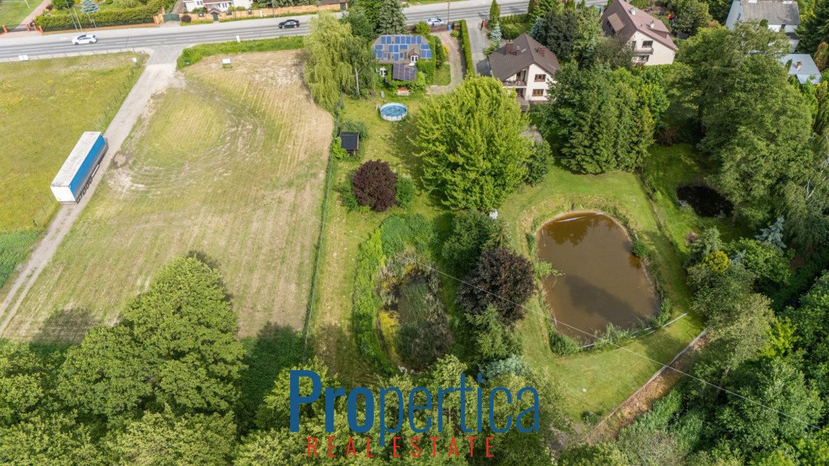 Niezaprzeczalnym atutem nieruchomości jest działka o powierzchni 2860 m² ze stawem i pięknymi wieloletnimi drzewami.
