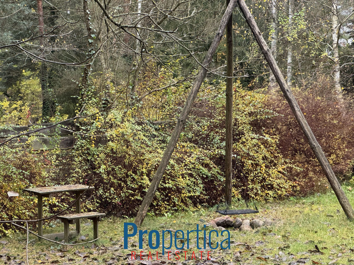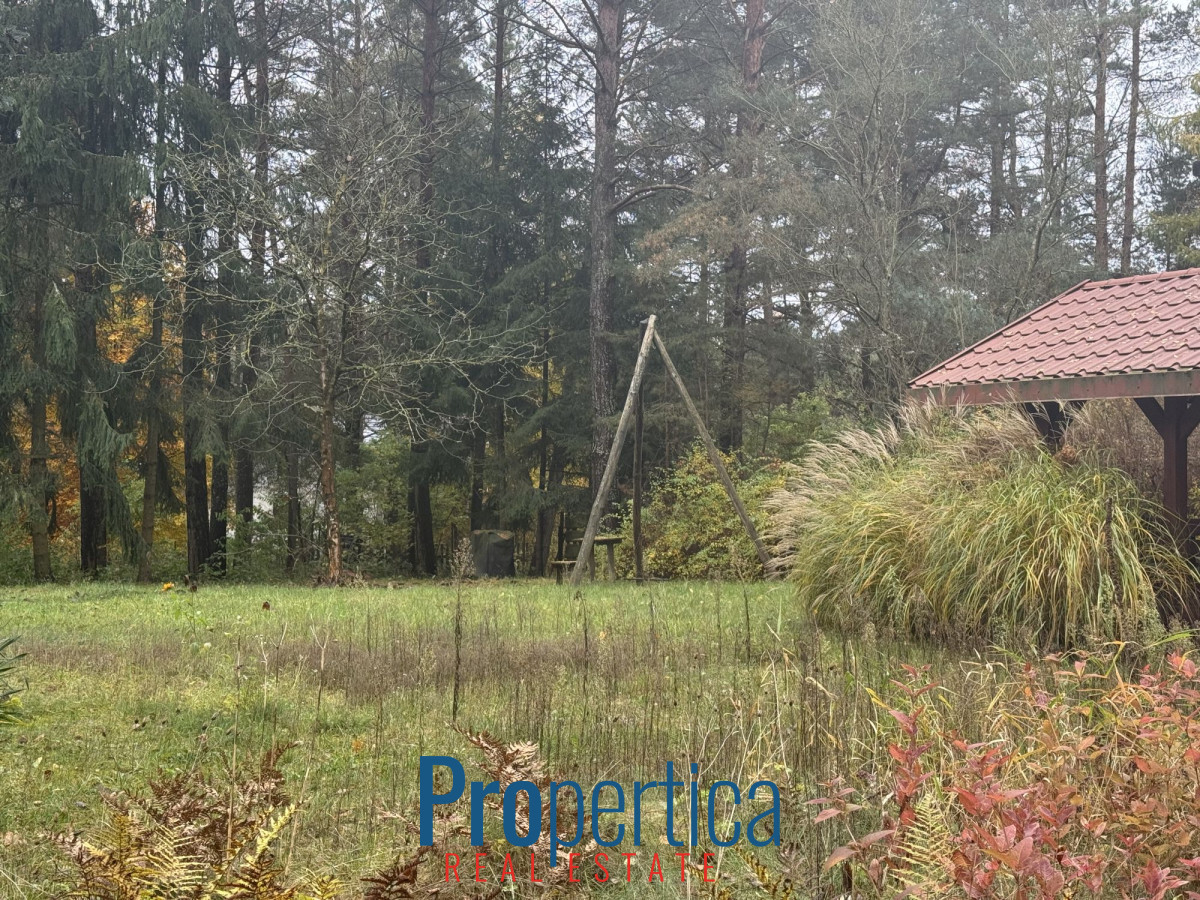 W ogrodzie znajduje się zadaszona, drewniana altana – idealne miejsce na ognisko nawet podczas deszczu.
