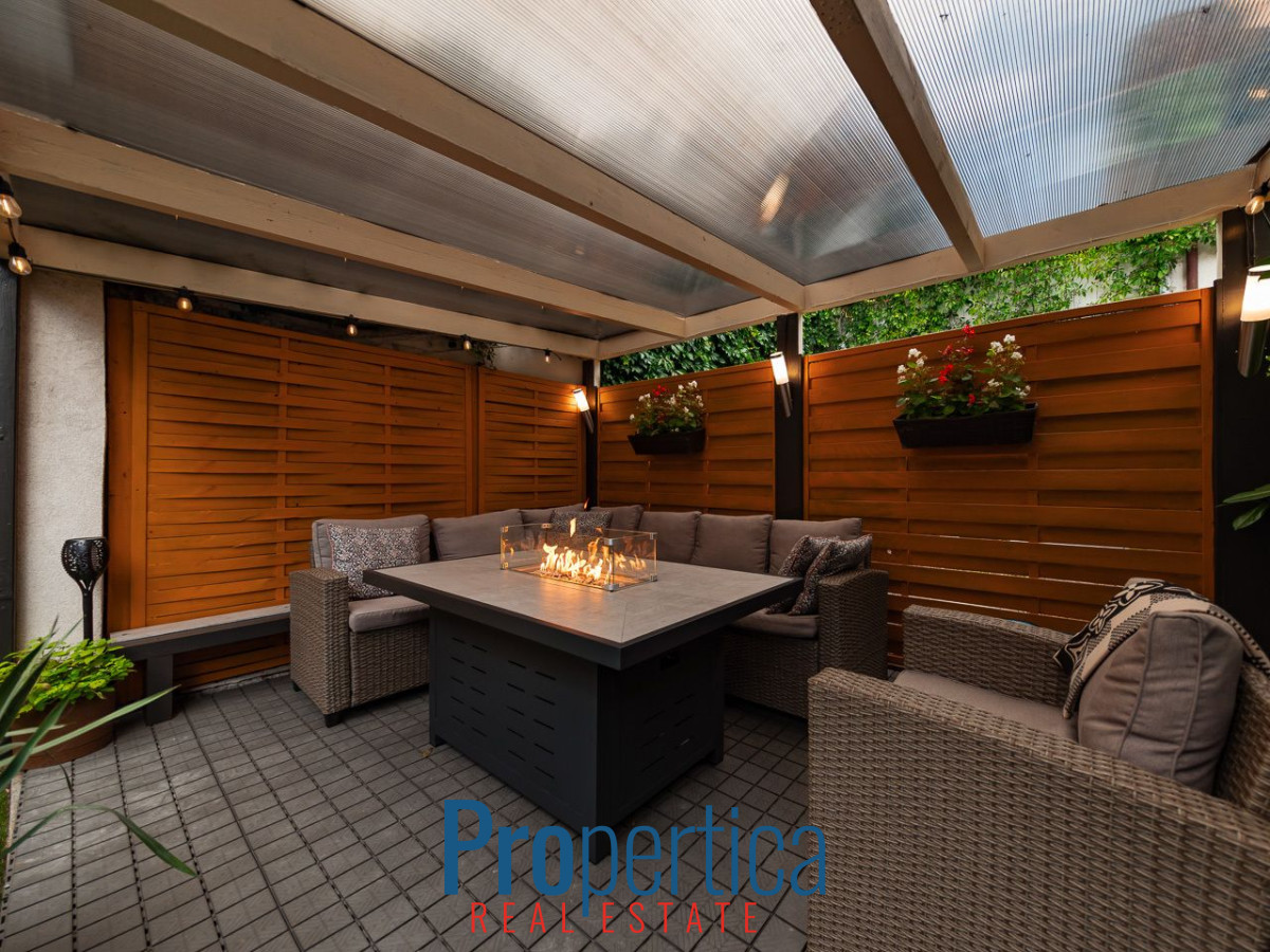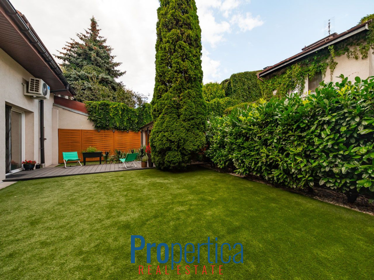 Dom posadowiony jest na prostokątnej, foremnej działce o powierzchni 261 m². Za domem znajduje się uroczy, kameralny ogródek z zaaranżowanym miejscem do wypoczynku (zadaszona altana).