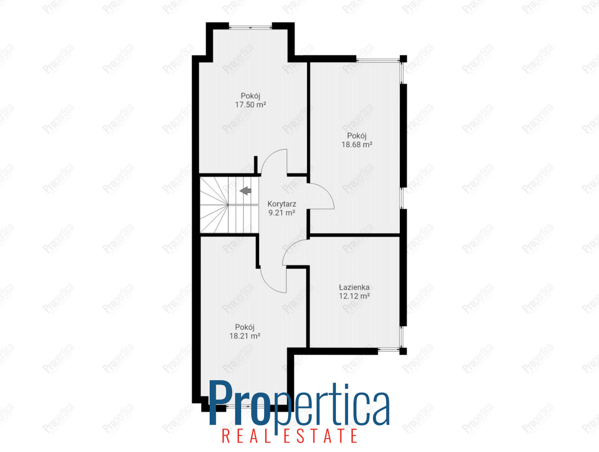 Trzy przestrzenne sypialnie (18,68 m², 18,21 m² i 17,50 m²) oraz łazienka z wanną (12,12 m²).