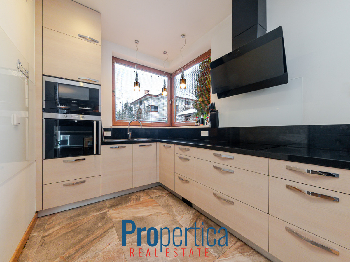 Wewnątrz znajda Państwo w pełni wyposażona obszerną kuchnię, duże, wygodne łazienki z wysokiej klasy armaturą i terrakotą. W sypialniach wysokiej jakości panele. Komunikację zapewniają zadbane drewniane schody.