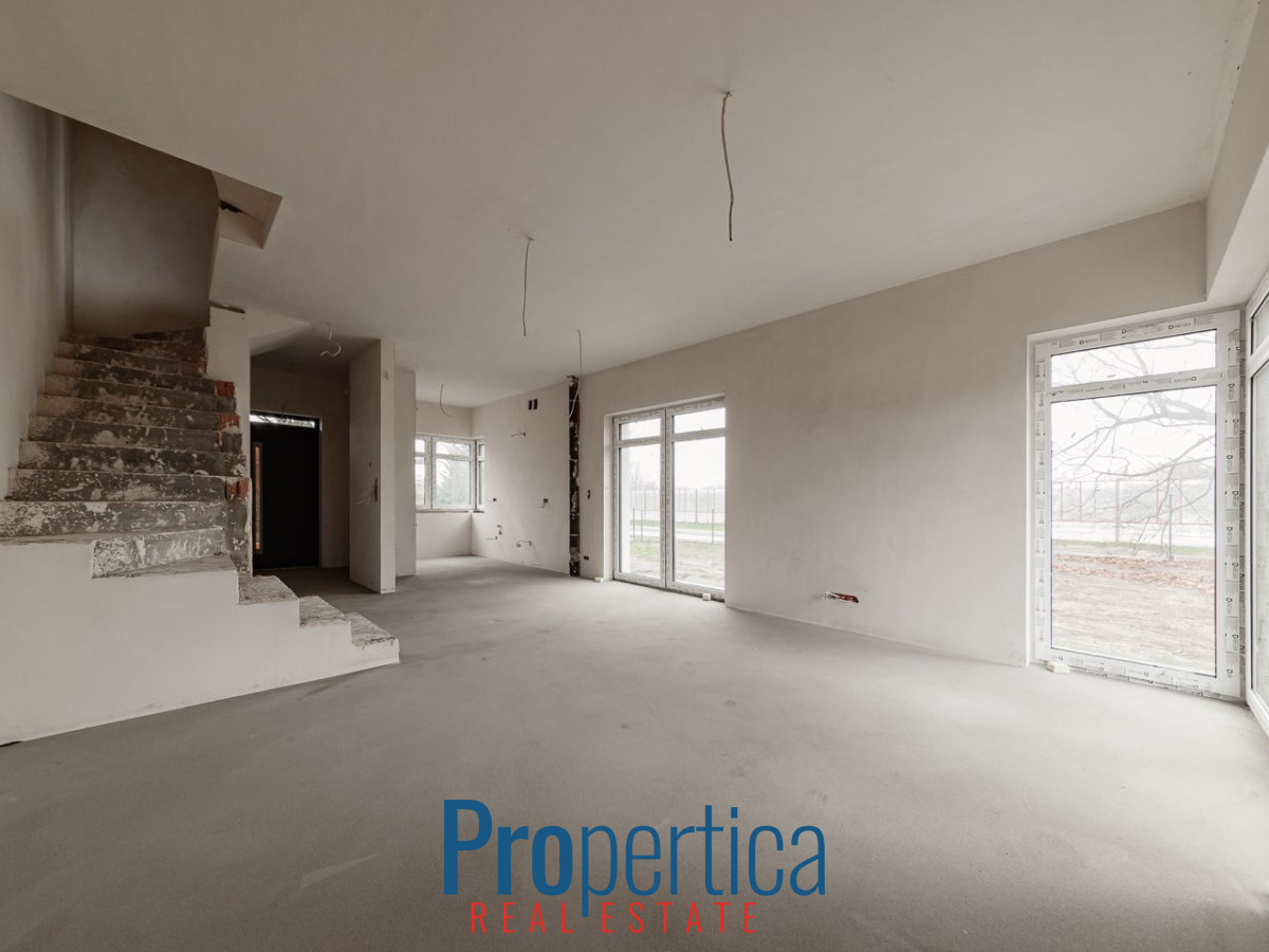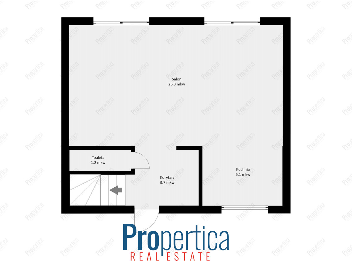 - Parter: przestronny salon z bezpośrednimi wyjściami do ogrodu, aneks kuchenny z jadalnią oraz WC.
