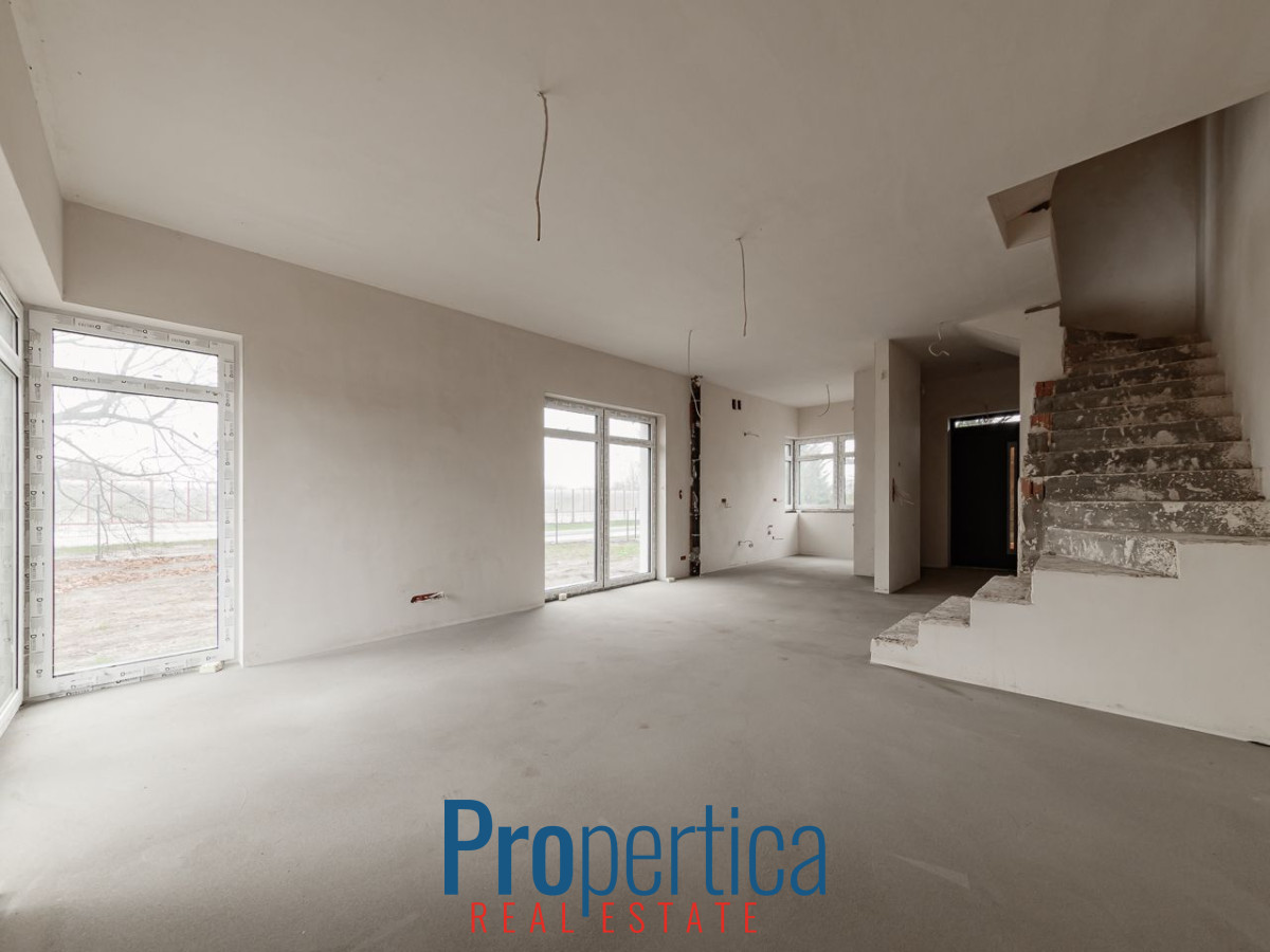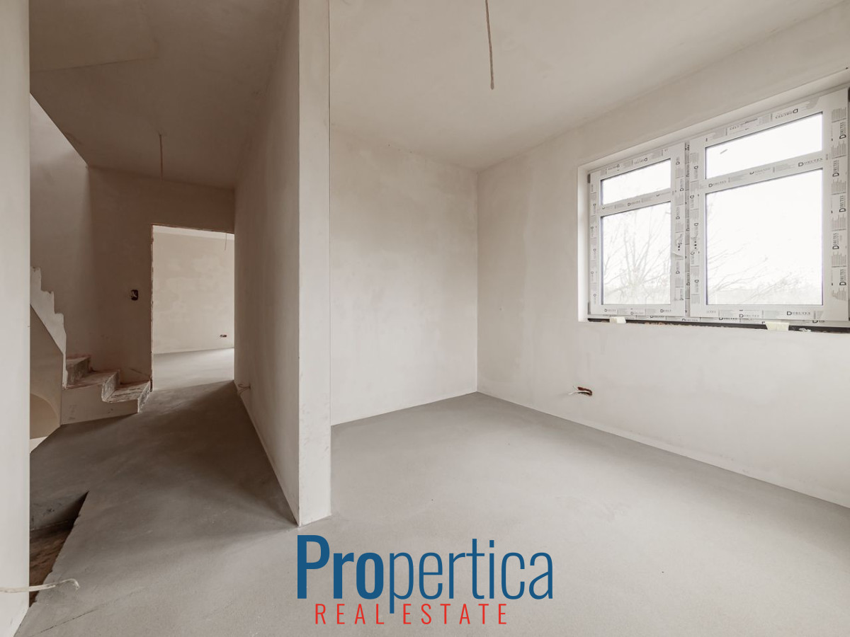 - Parter: przestronny salon z bezpośrednim wyjściem do ogrodu, aneks kuchenny z jadalnią, WC oraz pomieszczenie gospodarcze.