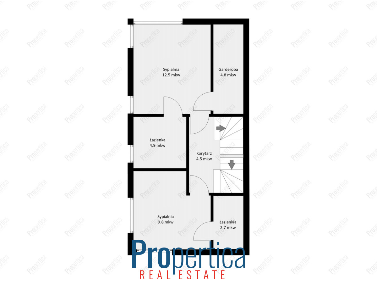 - Piętro: dwie ustawne sypialnie, dwie łazienki oraz garderoba.