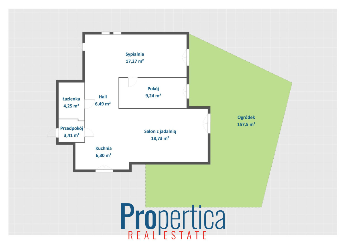 Do sprzedania unikatowe i klimatyczne trzypokojowe mieszkanie z ogródkiem na warszawskiej Białołęce, o powierzchni 64,74 m² (powierzchnia ogródka ok. 157,5 m²).
