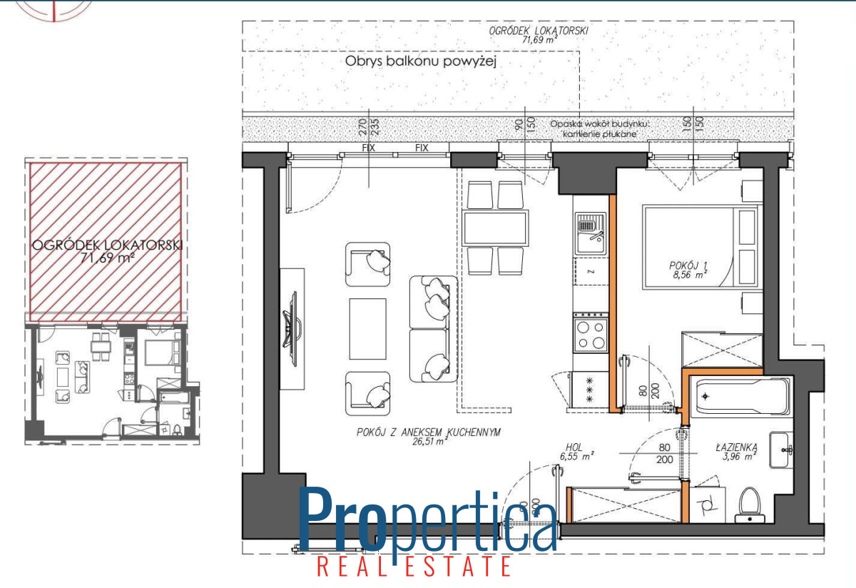 - salon z aneksem kuchennym (26,51 m²)