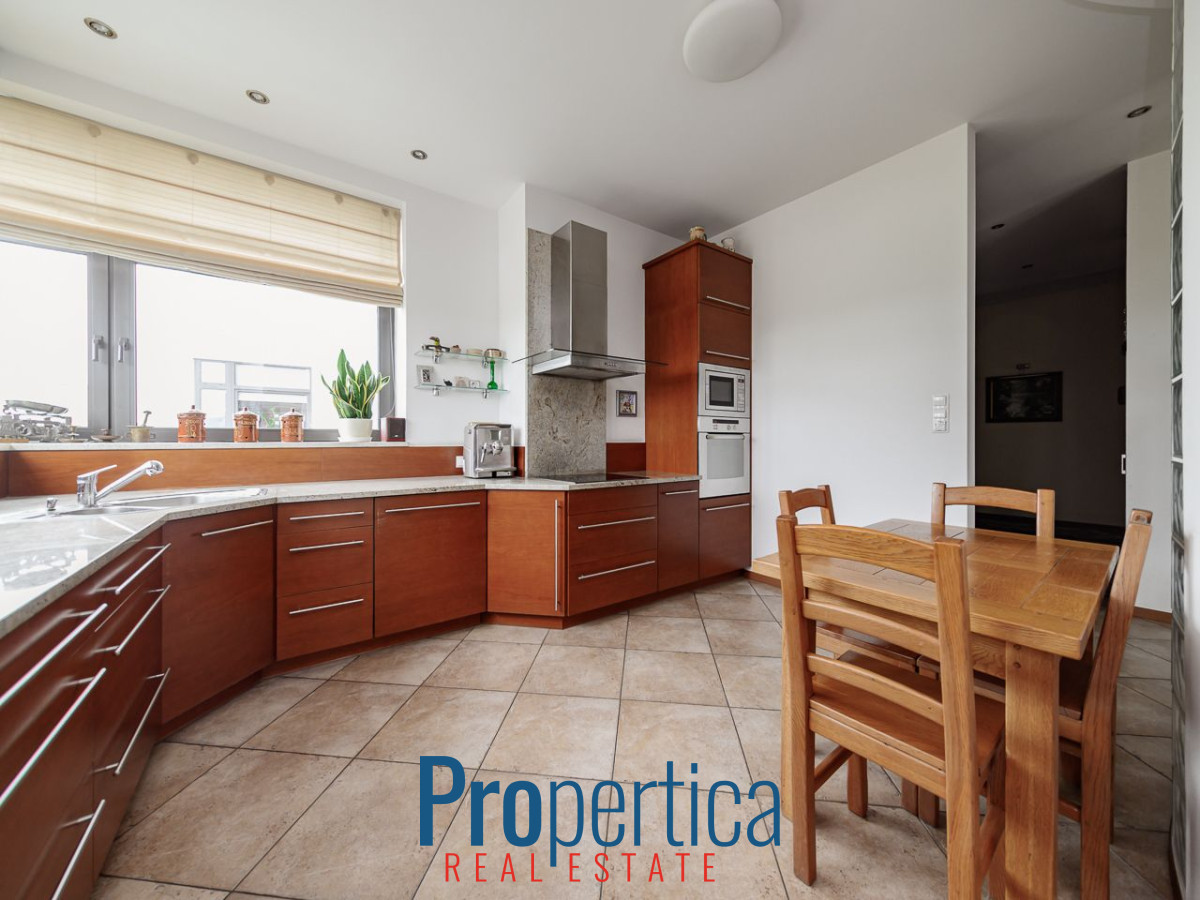 Apartament urządzony w uniwersalnym stylu, drewniane podłogi w salonie i sypialniach, w kuchni i łazienkach terakota. Kuchnia oddzielona od salonu luksferami, wyposażona we wszystkie potrzebne sprzęty, granitowe blaty.
