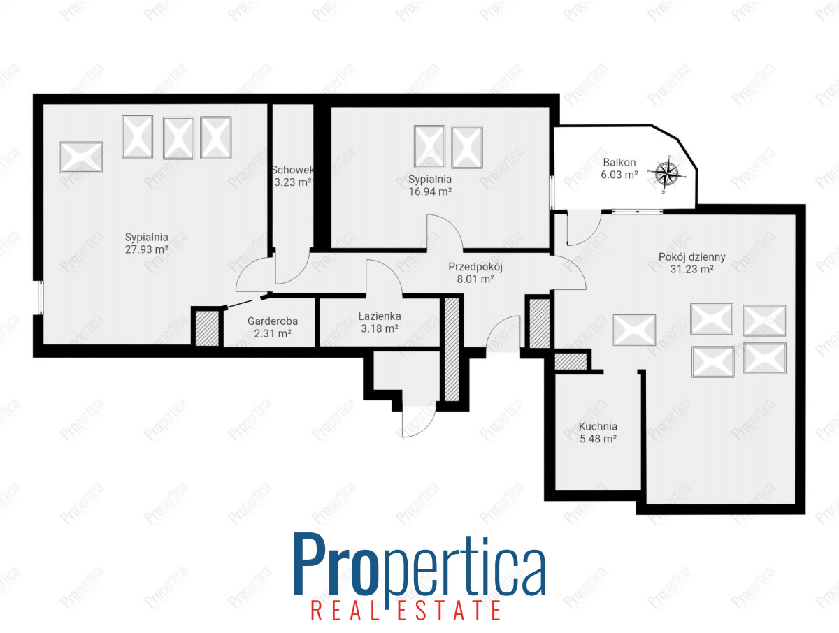 - pokój dzienny z aneksem kuchennym – 31,23 m²